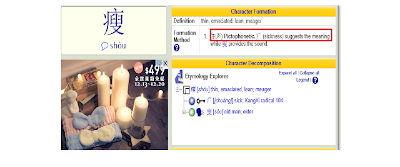 The word 瘦(shòu) means “thin”, this is what the most of the women around are aiming at. But if you take a look at the radical of the word you will find our ancestors considered 瘦(shòu) as a sign of illness. Being skinny is being ill. So we can actually see the Chinese thinking through our characters. I hope you find it interesting. :)